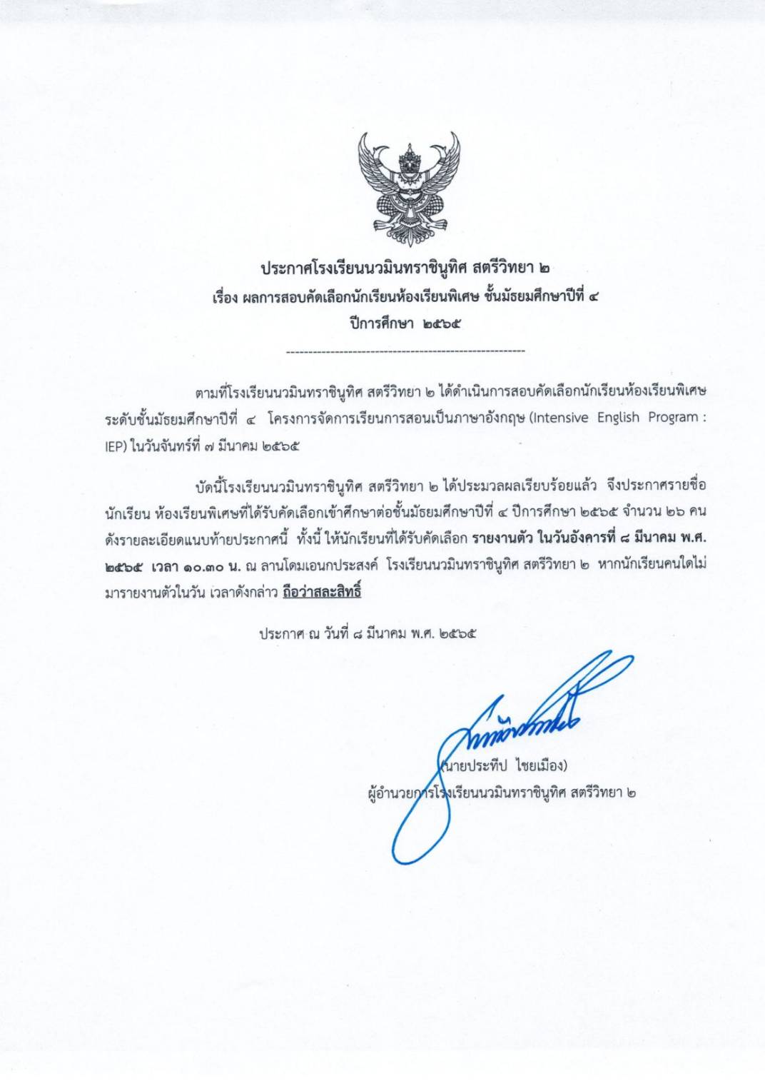 ประกาศผลการสอบห้องเรียนพิเศษ ชั้นมัธยมศึกษาปีที่ 4 ปีการศึกษา 2565
